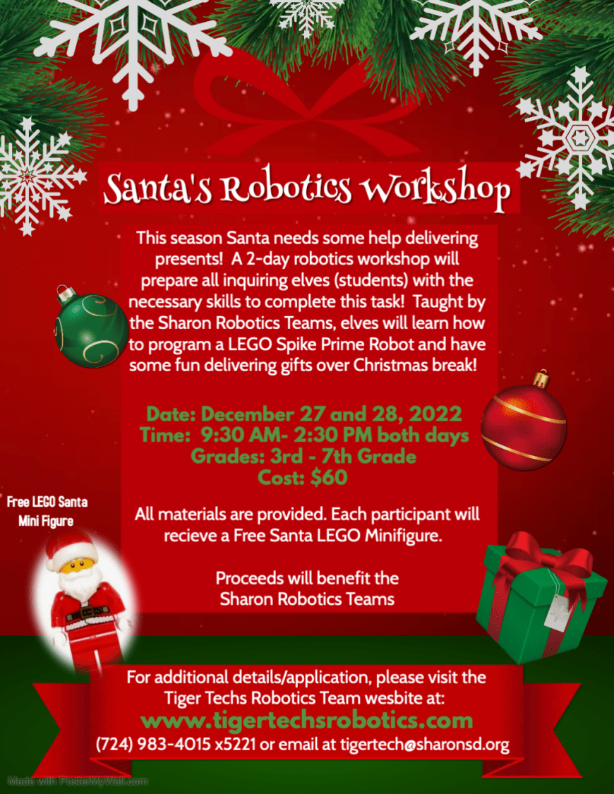 The Sharon Robotics Teams will be hosting a 2-day robotics workshop to prepare all inquiring elves (students) with the necessary skills to help Santa deliver his gifts over Christmas break! Taught by the Sharon Robotics Teams, elves will learn how to program a LEGO Spike Prime Robot and have some completing the Christmas themed tasks! This 2-day workshop will take place at Case Avenue Elementary School in Sharon. This camp is a beginner camp and no prior robotics/programming experience is needed to attend. All robots and materials will be provided for the two days.