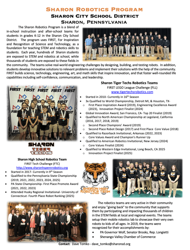 The Sharon Robotics Teams are located in Sharon, PA and are part of the Sharon City School District. The teams are part of the FIRST Robotics Program and consists of teams with FIRST LEGO League and FIRST Tech Challenge. Thanks to Gene Blair Jr. for his creation and work on this video on the Sharon Robotics Teams. To learn more about the teams, please watch our video and read about us below.