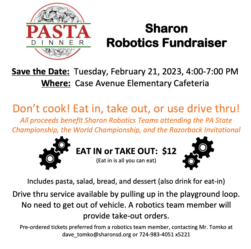 Save the Date: Tuesday, February 21, 2023, 4:00-7:00 PMWhere: Case Avenue Elementary Cafeteria Don’t cook! Eat in, take out, or use drive thru!All proceeds benefit Sharon Robotics Teams attending the PA FTC State Championship, the FIRST World Championship, and the Razorback Invitational EAT IN or TAKE OUT: $12(Eat in is all you can eat) IncludesContinue reading Pasta Dinner Fundraiser